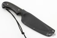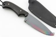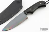 This Drop Point by Fred Perrin features a black blade with notched thumbrest, visible temper line, .140" blade stock and 1.252" blade depth, full tang construction. The handle is comprised of contoured black linen micarta scales with nickel silver pins and lanyard hole. Includes a kydex sheath. New from maker.