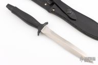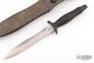 The Mark II is one of the best selling knives of all time. First introduced in 1966, this tactical knife is serialized for collectors. This one has a satin finished hand ground double edged partially serrated blade, .243" blade stock and .940" blade depth, hidden tang construction with a black aluminum handle. This knife is Serial #094902 and was made in 1980. Comes with a black leather sheath. Has a couple light marks otherwise excellent condition.