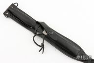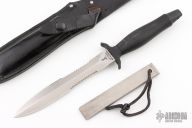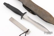 The Mark II is one of the best selling knives of all time. First introduced in 1966, this tactical knife is serialized for collectors. This one has a satin finished hand ground double edged partially serrated blade, .215" blade stock and .954" blade depth, hidden tang construction with a black aluminum handle. This knife is Serial #C84064 and was made in 1979. Comes with a black leather sheath and sharpening stone. Has a couple light marks otherwise excellent condition.