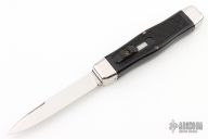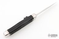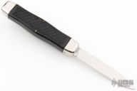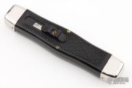 This knife features a mirror polished blade. The handle has a black plastic chasis with steel end caps. Light scratches are visible otherwise the knife is in good condition.