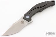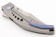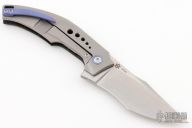 This SOS Flipper by Mechforce is a Tashi Bharucha design, it has a stonewashed blade with satin flats, notched thumbrest and flipper. The handle has a carbon fiber and bead blasted titanium frame with blue anodized titanium pivot collars and tip up clip. Rides on bearings, nice detent, lockup and blade seating. Comes with original box. New from maker!
