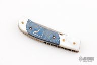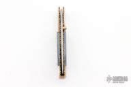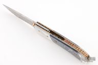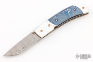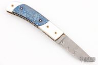 This knife by Frank Niro features a Damascus blade with a single gold thumbstud with a .05kt Diamond inlay. The handle has mother of pearl bolsters, blued Damascus scales with .015kt diamonds set in the gold screws, anodized and fileworked titanium liners with jeweled interiors and a fileworked and anodized titanium backspacer, has gold plated screws. Nice lockup, detent and blade seating. Comes with a zippered case. Excellent condition. Comes with paper work from the jeweler that set the diamonds.