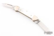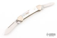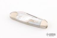 This Baby Butterbean by Case Knives features polished blades with nail nicks. The handle has nickel silver bolsters and cap, mother of pearl covers, nickel silver liners, stainless backspacers. Comes with original box and papers. Shows some patina. Excellent condition.