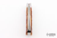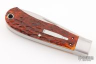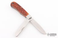 This slipjoint by Bill Ruple features two hand rub satin finished blades with nail nicks. The handle has stainless steel bolsters, jigg bone covers with stainless steel bullet escutcheon, stainless steel liners and springs. Has half-stops, flush in all positions. Comes with a zippered case. New from maker!