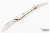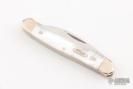This Peanut by Case Knives features polished blades with nail nicks. The handle has nickel silver bolsters and cap, mother of pearl covers, nickel silver liners, stainless backspacers. Comes with original box and papers. Excellent condition.