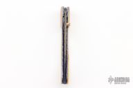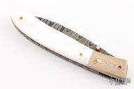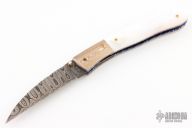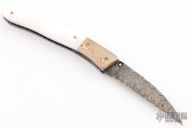 This Linerlock Folder by Fred Durio has a Damascus wharncliffe blade with fileworked spine and a single gold thumbstud with diamond inlay. The handle has mother of pearl scales, mokume bolsters, anodized and fileworked titanium liners, and fileworked and blued steel backspacer, gold plated screws. Nice blade seating, detent and lockup. Comes with a zippered case.