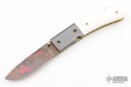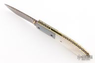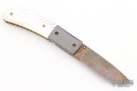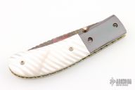 This Linerlock Folder (please let us know if you know who made this knife) has a Damascus blade with fileworked spine and a single gold thumbstud with diamond inlay. The handle has fluted mother of pearl scales, blued steel dovetailed bolsters, anodized and fileworked titanium liners, and fileworked and blued steel backspacer, fileworked screws. Nice detent and lockup. Comes with a zippered case. Excellent condition.