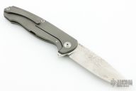 This knife by Cheburkov Knives features a Damascus blade with notched thumbrest and flipper. The handle has a carbon fiber scales over a bead blasted titanium frame with a matching tip up pocket clip.  Nice detent, lock up and blade seating.  Includes the original box and papers.  Excellent Condition.