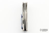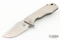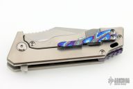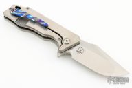 This Mini J-Cape from Something Obscene Company features a satin finished blade with notched thumbbrest and flipper tab. The handle has a satin finished titanium frame.  Tip up mokuti pocket clip with a matching backspacer. Comes with original box. Excellent condition.