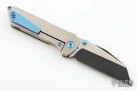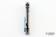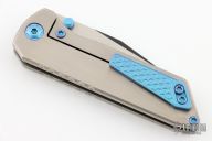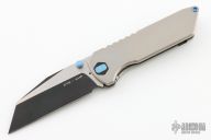 This knife features a two-tone wharncliffe blade with dual anodized thumbstuds. The handle has a titanium frame with a anodized titanium tip up pocket clip. Includes the original box and papers.