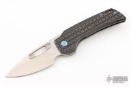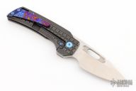 This Nymble Framelock Flipper by EMP EDC features a satin finished blade with notched thumbrest and flipper, and a thumbhole. The handle has a black tumbled and frag pattern milled frame, mokuti backspacer and tip up clip, comes with original anodized titanium backspacer and tip up clip. Comes with original box. Rides on bearings, nice detent, lockup and blade seating. Excellent condition.
