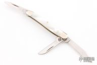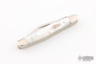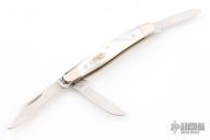 This mini stockman by Case Knives features polished blades with nail nicks. The handle has nickel silver bolsters and cap, mother of pearl covers, nickel silver liners, stainless backspacers. Comes with original box and papers. Excellent condition.
