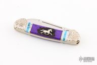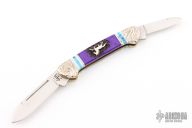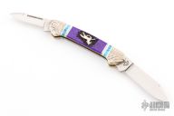 This Baby Butterbean by Case Knives features polished blades with nail nicks. Customized by David Yellowhorse, the knife has brass liners, sterling bolsters, stone inserts with nickel silver inlays. Strong lock up. Comes with original box and papers. Excellent condition.