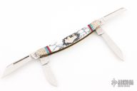 This 4 Blade Congress by Case Knives features four blades with nail nicks. Customized by David Yellowhorse is a lock back with a brass frame, stone inserts with nickel silver inlays. Strong lock up. Includes original box and papers. Excellent condition.