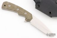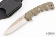 This Lightspeed fixed blade by Steven Kelly features a drop point satin finished blade with notched thumbrest, .151" blade stock and 1.075" blade depth, full tang construction. The handle has green G-10 scales. Comes with a kydex sheath. Has a couple sheath scratches, otherwise excellent condition.