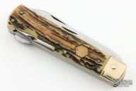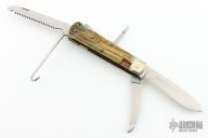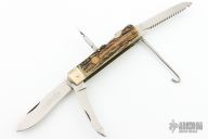 This legendary knife features satin finished stainless steel (Rostfrei) blades. The handle has nickel silver bolsters, stag scales, brass liners and stainless steel springs. Has brass hexagon inlay stamped "008" or "800" not sure which is correct. Main blade is a lockback, lock tab is stamped "74606". Has a drop point blade, a hawkbill blade with rounded tip, saw blade with bottle opener, carry hook, and leather punch. Has some patina and scratches, but overall good condition for its age.