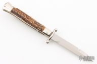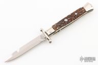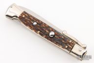 This 9" Swinguard Auto from A.G.A. Campolin has a mirror polished stainless steel spear point blade with false top edge. Handle has stag scales with mirror polished nickel silver bolsters and pommel, brass liners, brass pins, stainless steel back spacer, and a safety. Excellent condition.