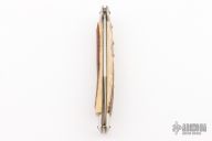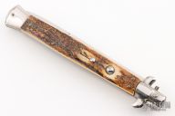 This 13" Swivel Bolster features a polished ground blade with false top edge. The handle has stainless steel bolsters, front and rear, stag scales, brass liners, stainless spring. Has some light scratches, otherwise excellent condition.