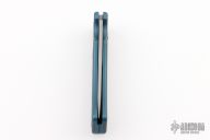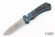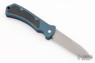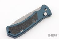 This Side-opening coil spring automatic by Paragon features a bead blast drop point blade. Blue aluminum frame with rubber inlays. Has some light scuffs, otherwise excellent condition.
