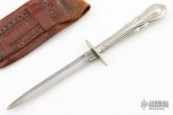 This Dagger was made by Kissing Crane Cutlery in Sheffield England. It features a double edged blade with .097" blade stock and .439" blade depth, hidden tang construction. The handle has nickel silver guard with silver grip. Comes with a brown leather sheath. Has some scratches and patina, otherwise good condition for its age.