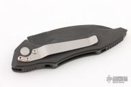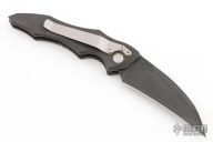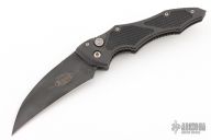 This Kestrel side-opening automatic by Microtech has a black plain edge blade and is dated 7/99. Stainless steel clip. Green posts. Handle features non-slip rubber inserts. Has some scuffs and scratches, great condition for its age.