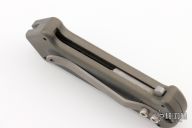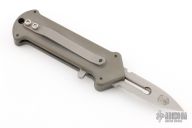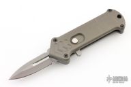 This Cupid by Rob Dalton is an OTF automatic and features a double-edged bead blasted chisel ground blade and milled aluminum handle. Bead blast titanium clip. Fires via push button and retracts by holding the button and moving the slider on the side of the knife. Fires hard, has some light scuffs, otherwise excellent condition.