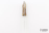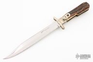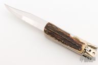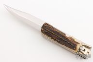 This leverlock swing guard folding boot knife by Hoffritz features a mirror polished blade with false top edge. The handle has a folding nickel silver guard, stag scales, brass liners and a stainless steel backspacer. Has some scratches, otherwise excellent condition.