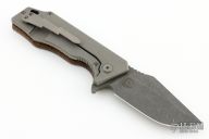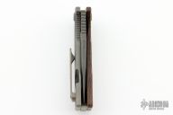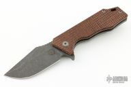 This Mini J-Cape from Something Obscene Company features a black tumbled blade with notched thumbramp and flipper tab. The handle is burlap micarta and tumbled titanium with matching titanium clip and backspacer. Comes with original box and COA. Excellent condition.