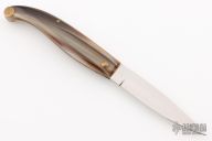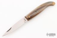 This slipjoint from S. Berti features a mirror polished drop point blade with nail nick. The handle has honey horn covers over a stainless steel backspring. Excellent condition.