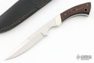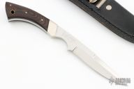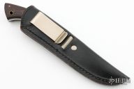 This dagger features a satin finished blade with a false top edge and notched thumbrest, .173" blade thickness and .876" blade depth, full tang construction. The handle has nickel silver bolsters and black/brown paper micarta scales with nickel silver pins. Great feel in the hand. Classic Samson design. Includes leather sheath. Excellent condition.