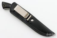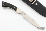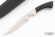 This dagger features a satin finished blade with a false top edge and notched thumbrest, .173" blade thickness and .876" blade depth, full tang construction. The handle has nickel silver bolsters and brown paper micarta scales with nickel silver pins. Great feel in the hand. Classic Samson design. Includes leather sheath. Excellent condition.