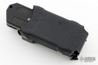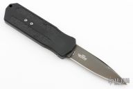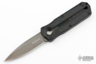 This knife is discontinued. The blade with black. Black aluminum handle with non-slip inserts. Comes with kydex sheath. Blade is deployed when it is removed from the sheath. It retracts when you put it back in the sheath. Excellent condition.