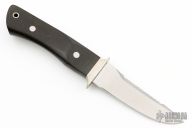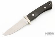 This Argonaut/Natchez AD681 by Benchmark Knives features a satin finished blade with serrated top edge, .177" blade stock and 1.042" blade depth, full tang construction. The handle has a nickel silver guard, black linen micarta, thong hole. Comes with a black leather sheath with boot/belt clip. Has scuffs and scratches, good condition otherwise.