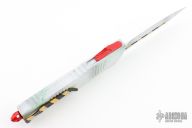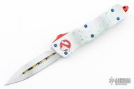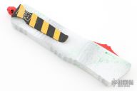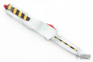 This Combat Troodon OTF automatic by Microtech knives features a Slime white double edged blade, and a Slime white aluminum handle with blue and red hardware, tip down clip. Glass breaker. Prototype. Comes with original box and papers. New from maker at the 2023 NCKS.