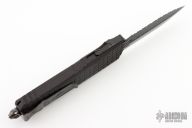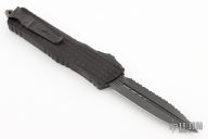 This Combat Troodon OTF automatic by Microtech knives features a fully serrated double edged DLC finished blade. The handle has a DLC frag pattern aluminum handle with black hardware, tip down carry. Glass breaker. Comes with original box and papers. New from maker at the 2023 NCKS. Date and S/N may differ from picture.