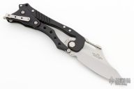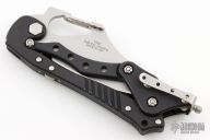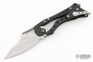 This E.T. (External Toggle) folder by Kershaw is a Grant and Gavin Hawk design, it features a bead blasted blade, black aluminum frame, and the Hawks' external toggle locking mechanism. The knife is very easy to open and close, and simply gripping the handle will keep the blade locked in the open position. There is a knurled roller safety on the spine that can be engaged to prevent partial opening of the blade during carry. Has some light scuffs and scratches, great condition otherwise.