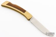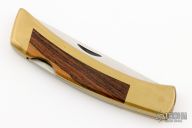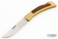 This large Folding Sportsman by Gerber features a polished drop point blade with nail nick. The handle has a brass frame with wood inlays. Comes with original box and leather sheath. Excellent condition.