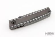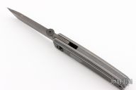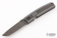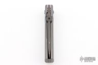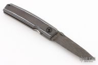 This Tengu by Jared Oeser features a Starfire Stainless Damascus blade with black/white Carbo Quartz thumbdisc. The handle has black/white Carbo Quartz scales with grey G-10 escutcheon and liners, bead blasted titanium liners, black/white Carbo Quartz backspacer. Comes with a black leather pocket sheath, original box, and COA dated 1/4/22. Rides on bearings. Nice detent, lockup, action and blade seating. Excellent Condition.