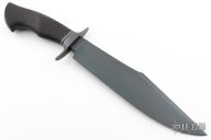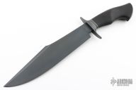 This Knight Bowie by Master Smith Jason Knight features a black tumble finished blade with false top edge, .311" blade stock and 2.395" blade depth, hidden tang construction. The handle has a blackened steel guard with an African Blackwood grip. Comes with a zippered case and COA dated November 2023. New from maker at the 2023 NCKS.