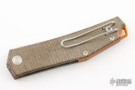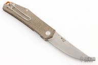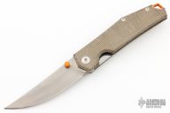 This ACE Clyde by Giant Mouse Knives features a stonewashed upswept blade with an orange thumb stud and backspacer. The handle features green canvas micarta scales. Comes with original box. Excellent Condition.
