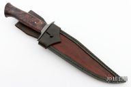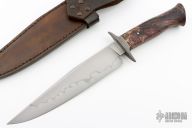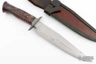 This Bowie by ABS Apprentice Corey Dunlap features a hand rub satin finished blade with beautiful hamon, .191" blade stock and 1.586" blade depth, hidden tang construction. The handle has a wrought iron guard, Yellow Cedar Burl wood grip with a nickel silver spacer and hand peened pin. Comes with a brown leather sheath and frog with lizard skin inlay. Comes with a zippered case. New from maker at the 2023 NCKS.