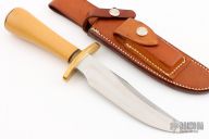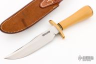 This Model 12-6 Little Bear Bowie from Randall Made Knives features a satin finished blade with a sharpened top edge, .232" blade stock and 1.256" blade depth, hidden tang construction. The handle has a brass forward curved guard, Westinghouse paper micarta grip with fileworked brass collard and brass spacers, brass coolie cap butt. Comes with a brown leather roughback sheath and a zippered case. Excellent condition.