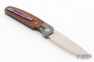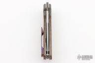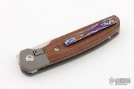 This Caballero Front Flipper by Enrique Pena features a hand rub satin finished drop point blade with swedge, notched thumbrest and front flipper. The handle has a blasted titanium frame with brown canvas micarta inlays, and a tip up mokuti clip. Nice detent, lockup and blade seating. Comes with zippered case. New from maker