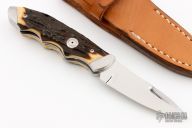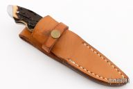 This Two Way Dagger by Kansei Matsuno features a mirror polished blade with false top edge, .156" blade stock, .946" blade depth. Unique liner lock convertible construction allows this dagger to change from a straight dagger to a push dagger. Beautiful, well-matched stag scales and polished stainless bolsters. Excellent work. Comes with brown leather sheath. Has a few very fine scratches, excellent condition.