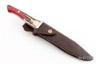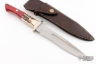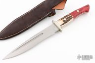 This Fighter by Fumio Inagaki features a hand rub satin finished blade with fullers and false top edge, .192" blade stock and 1.333" blade depth, full tapered tang construction. The handle has a nickel silver guard with stag and dyed maple burl wood scales and red spacers. Comes with a brown leather sheath. Excellent condition.