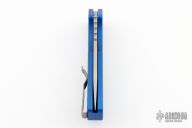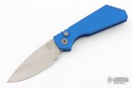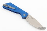 This Pro-Strider PT by Pro-Tech and Strider Knives features a tumbled finished blade with notched thumbrest. The handle has a blue aluminum frame with bead blasted hardware and black stainless steel tip up clip. Includes the original box and papers. New condition.