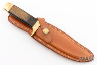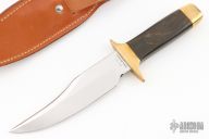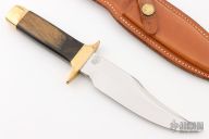 This Bowie from Smith & Wesson features a mirror polished clip point blade with a nearly sharpened top edge, .248" blade stock and 1.402" blade depth, hidden tang construction. The handle is comprised of a brass guard and pommel with hood handle. Includes original leather sheath. Excellent condition. #12122