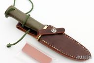 The Model 28 by Randall Made Knives is an excellent skinning and outdoors knife. Has a satin finished drop point blade with false top edge and notched thumbrest, stainless steel blade, .161" blade stock and 1.084" blade depth, full tang construction. The handle has a brass guard, green linen micarta handle and a lanyard hole at the butt. Comes with brown leather sheath and original paper wrapping. New from maker.