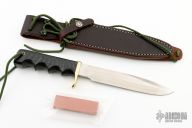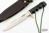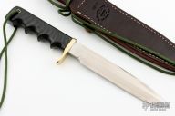 This Model 16 Diver from Randall Made Knives has a satin finished stainless steel spear point blade with sharpened top edge and notched thumbrest, .213" blade stock and 1.116" blade depth, full tang construction. Handle has a brass guard, black linen micarta single finger grip handle. Comes with waxed brown leather sheath and original paper wrapping. New from maker.
