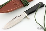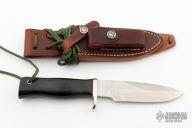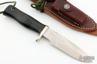 This Combat Companion by Randall Made Knives features a satin finished blade with sharpened top edge, .175" blade stock and 1.229" blade depth, full tang construction. Black linen micarta handle and nickel silver guard, lanyard hole at the butt. The Combat Companion is one of Randall's non-catalog knives. Includes a brown leather sheath and original paper wrapping. New from maker!